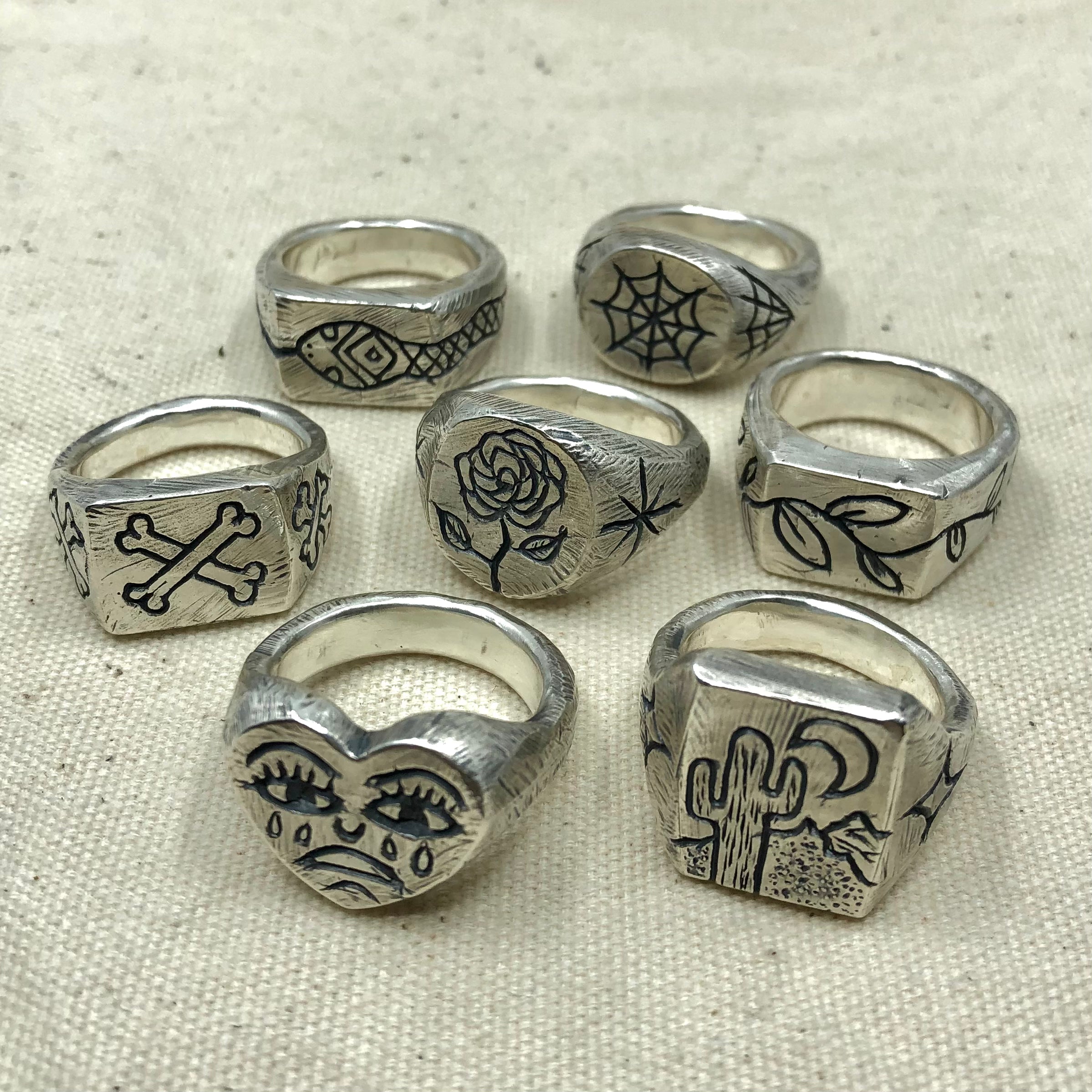 Inspired by flash sheets from tattoo artists, these hand engraved signet rings are the jewellery embodiment of simple classic tattoos. Handmade from 925 sterling silver.